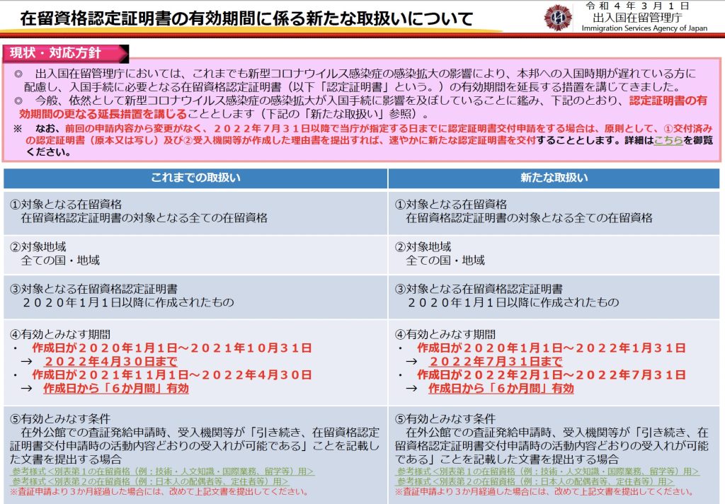 3月1日、出入国在留管理庁から、すでに交付されている在留資格認定証明書の有効期限が、再度延長になりました。 2020年1月1日〜2022年1月31日の2年1ヶ月間に交付された在留資格認定書の有効期限は、2022年7月31日までに延長されました。また2022年2月1日〜2022年7月31日までに交付された在留資格認定証明書の有効期限は、発行日から「6ヶ月間」となりました。 -