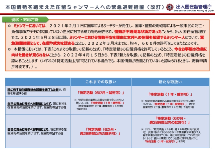 日本政府では、4月15日からミャンマーにおける情勢不安を理由に、在留を希望するミャンマー人に対し、緊急避難措置として、在留や就労を認めることとしました。 -
