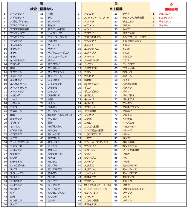 5月26日、厚生労働省の発表により、6月1日からの入国に関する水際対策で、 「検疫所による入国時検査を実施 せず、入国後の自宅等待機を求めない『青』区分の国・地域として、 インドネシア、ミャンマー、タイ、台湾、ハンガリー、フィリピン、ポーランドなどが指定されました。 -