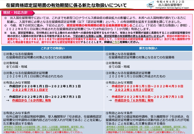 在留資格認定証明書を有効とみなす期間が変わりました。 ・作成日が2020年1月1日~2022年4月30日 →2022年10月31日まで有効 ・作成日が2022年5月1日~2022年7月31日 →作成日から「6か月間」有効 -