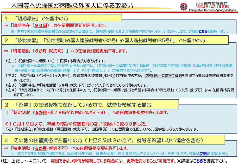12/1より、短期滞在を含め、帰国困難者に対して資格外活動許可を入管で申請すれば、週28時間までのアルバイトができるようになりました。 -