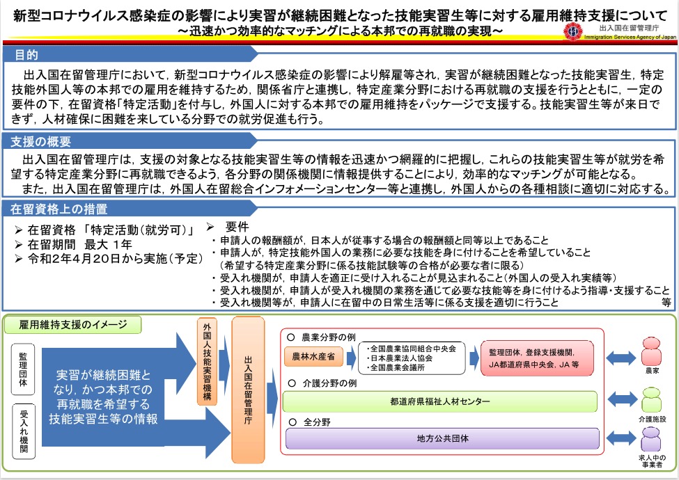 新型コロナウイルス感染症の影響により解雇等され,実習が継続困難となった技能実習生,特定技能外国人等の支援策が公表された。 -