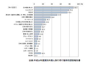 東京にもたくさんの外国人が観光で訪れますが、彼らはどこへ行き、なにをするのでしょうか? 東京都が9月に公表した「平成26年度国別外国人旅行者行動特性調査報告書」の「訪都中に行った活動(複数回答)」によると、「日本食を楽しむ」「ショッピング」「街歩き」が上位三位でした。... -