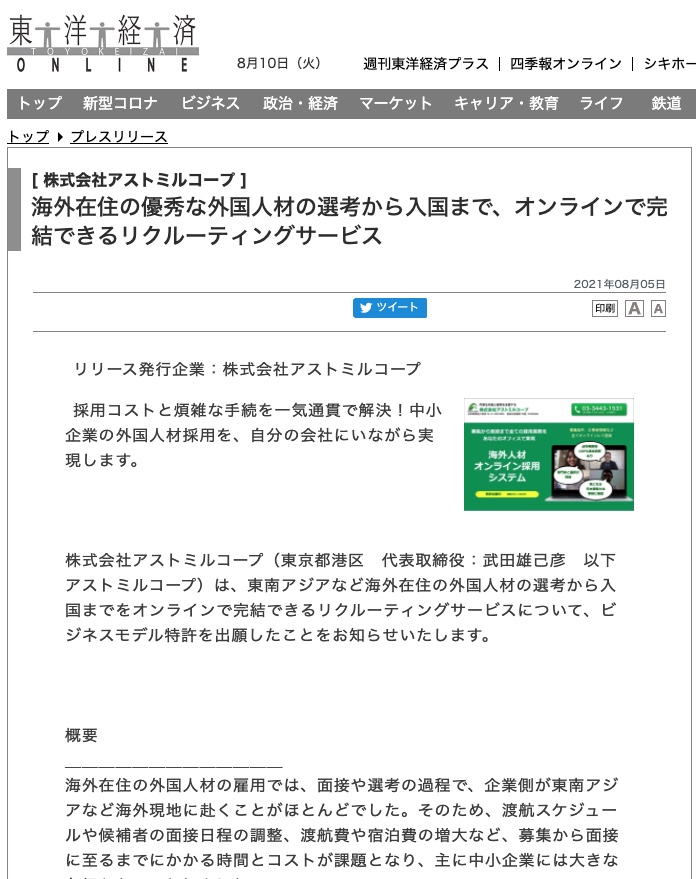 2021年8月5日にオンラインリクルーティングシステムに関するビジネスモデル特許の出願のプレスリリースをさせていただきましたところ、22メディアにて転載いただきました。 各メディアの方々、取り上げていただきましてありがとうございました。 東洋経済オンライン、プレジデントオンライン、@DIME、現代オンラインなど、著名なオンラインメディアに複数取り上げられたことは、海外人材のオンラインリクルーティングシステムの可能性に興味を持っていただけたのだと自負しております。 -